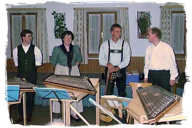 Aber noch mehr: bei einem gemütlichen Abend im Gasthof Alter Wirt in Rosenheim-Aising hat in einer öffentlichen Veranstaltung am 07. Oktober 2002 das Rosenheimer Zithertrio die Landler, Walzer, Mazurka, Polka-Mazurka, Schottisch und Polka für ein aufmerksames und begeisterungsfähiges Publikum hörbar gemacht. Das Ensemble (s. Bild von links nach rechts) mit Andreas Osterhammer aus Frasdorf, Sabine Riemer und Martin Prochazka (Kontragitarre) aus Fischbachau sowie Helmut Scholz aus Rosenheim ließ abwechlungsreiche Sätze in eigenem musikalischen Ausdruck erklingen.