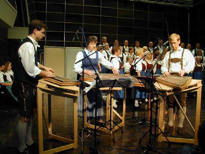 | Bild links: Das Rosenheimer Zithertrio beim Treffpunkt Volksmusik, Studio II - Bayerischer Rundfunk Im September 2002 präsentierte sich das Zither-Ensemble erstmals dem Publikum im Rahmen der beliebten Sendereihe. "...man hätte einen Zitherring fallen hören, so konzentriert war die Atmosphäre beim Treffpunkt Volksmusik ...", schildert Stefan Semoff, Bayerischer Rundfunk Abteilung Volksmusik seine Begegnung mit dem Rosenheimer Zithertrio. Einige der Aufnahmen mit Sabine Riemer, Andreas Osterhammer und Helmut Scholz können Sie auf der CD hören! |