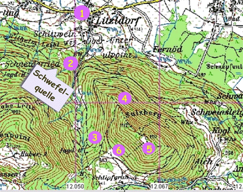 Wir beginnen den Anstieg bei der Kirche (1) in Litzldorf und folgen den Wegweisern zum Sulzberg. Am Hinweis zur Schwefelquelle (2) vorbei, führt uns der schmale Weg zum oberen Litzldorfer Wasserbehälter. Am Talende (3) zweigen wir nach links ab und steigen den Pfad hinaus zum Westrücken (5). Nun den Rücken hinauf bis zum Gipfel (5). Den Abstieg treten wir nach SW an, steil bergab zu den Almwiesen der Schlipfgrub (6) und weiter durch den Bergwald hinunter zur Schwefelquelle. Nach ausgiebiger Wellness an der Quelle, treten wir den Rückweg nach Litzldorf an, zweigen auf halben Weg nach links ab hinunter zum Wasserfall. Den Bach folgend kommen wir zum Zementwerk, einem Industriedenkmal aus dem 19. Jahrhundert. Nun zurück ins Dorf, wo uns die Wirtsleute Lisi & Hans vom Gasthof Höss zu einer gemütlichen Einkehr erwarten.